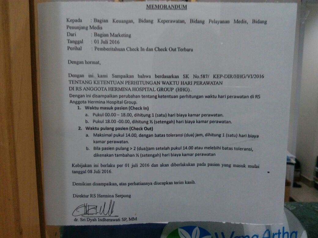 Ketika saya mau melunasi pembayaran sekitar 11.30, saya kaget karena saya ditagih 3 hari menginap di kamar. Saya terus komplain ke kasir. Kan saya checkout sebelum jam 12, harusnya dihitung 2 hari saja karena masuk Minggu pukul 14.00. Kemudian disodorkanlah aturan biaya inap di RS Serpong terbaru per 8 Juli 2016 berikut